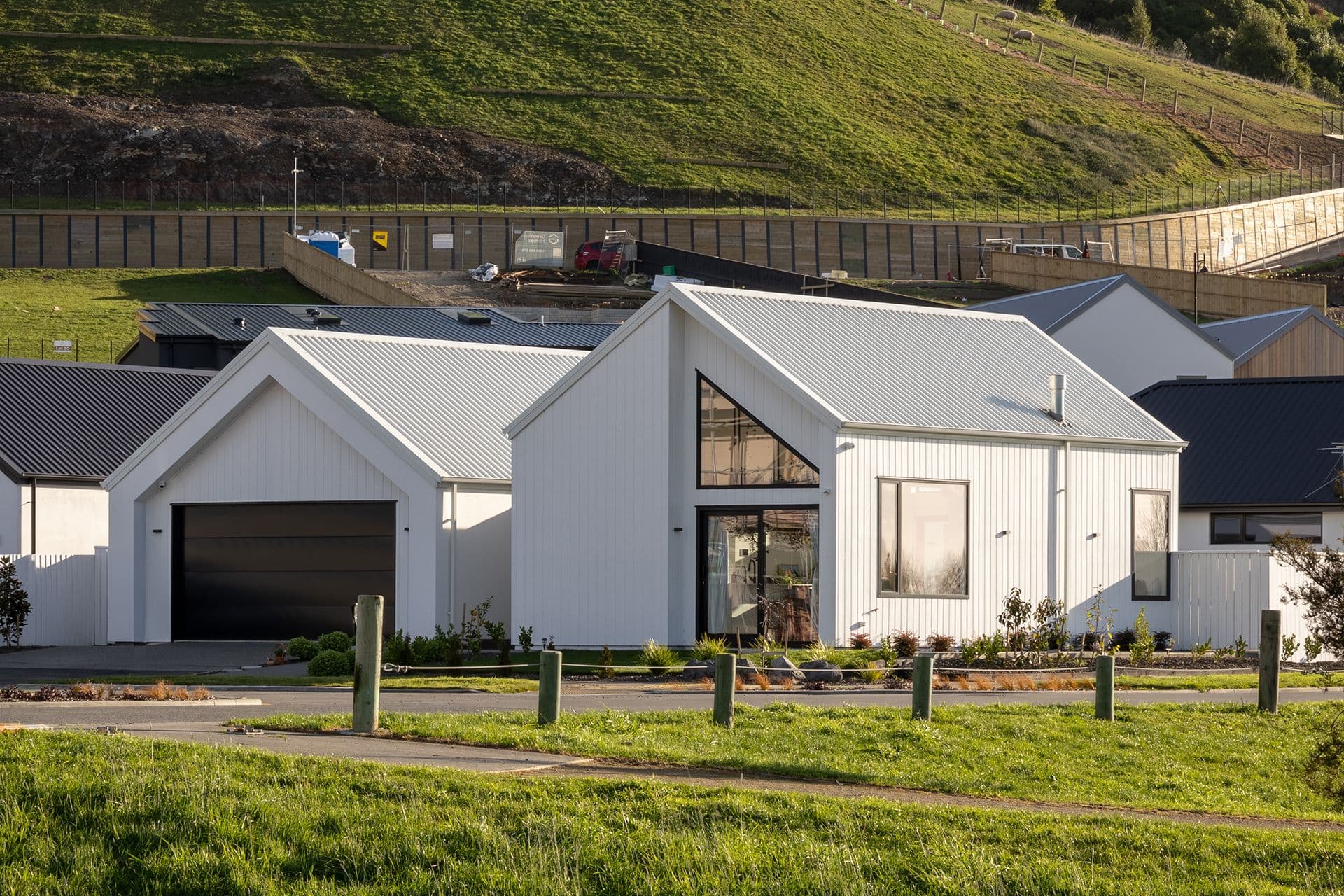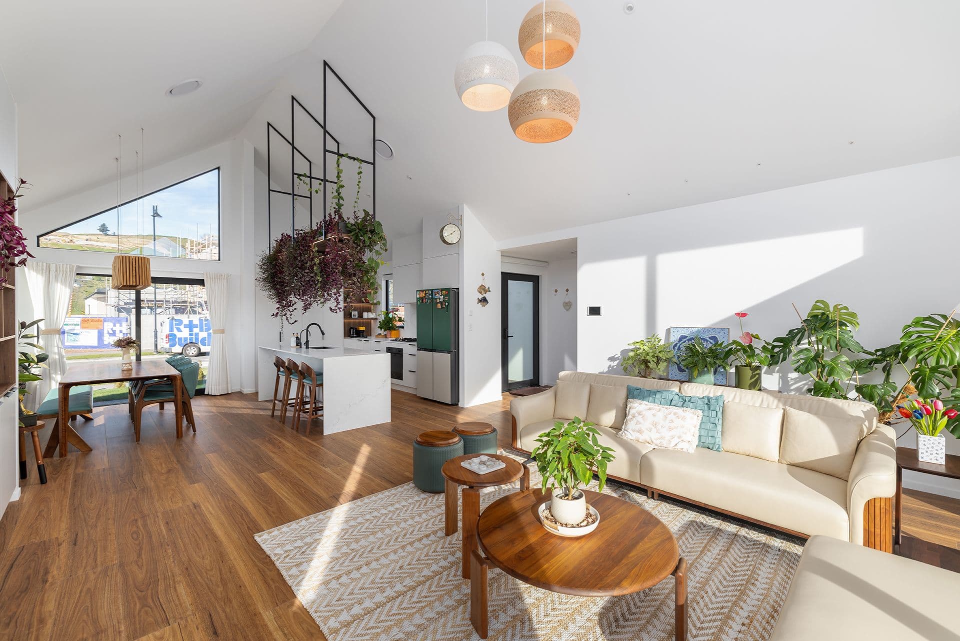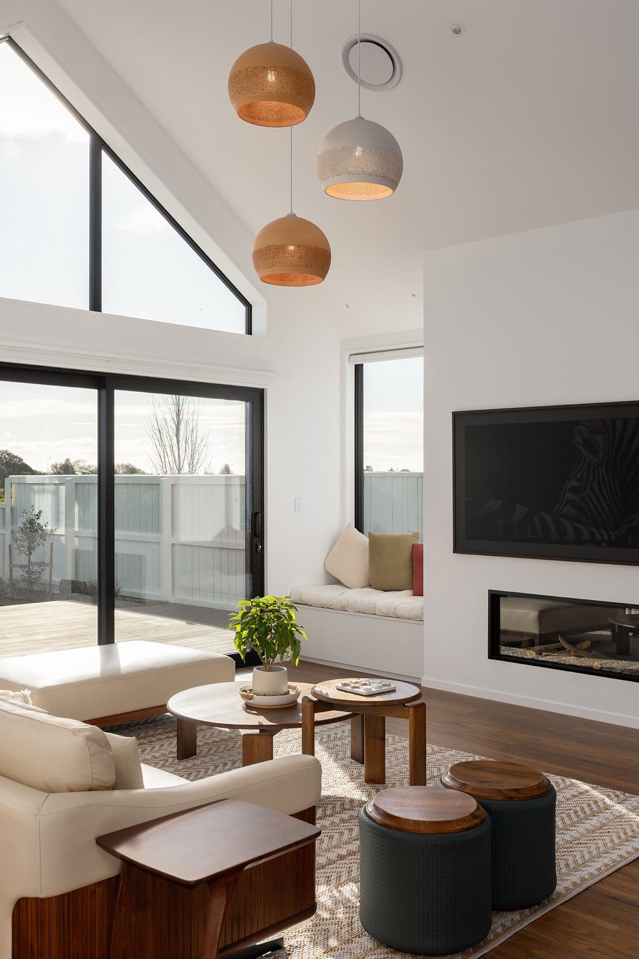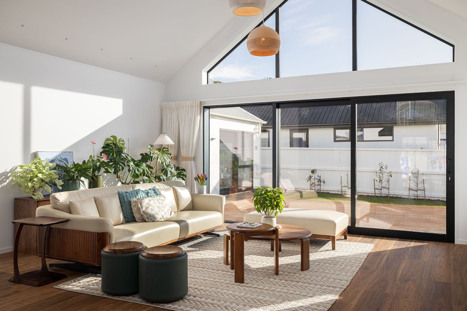 Located on a corner site in Cashmere Estate, this home showcases the classic pavilion shape. One wing is clad in Oblique for texture and detail, while the other features smooth Rockcote plaster for a crisp contrast. A raked roof in the main living area draws in light from both sides, creating a bright, airy space with a greater sense of volume.