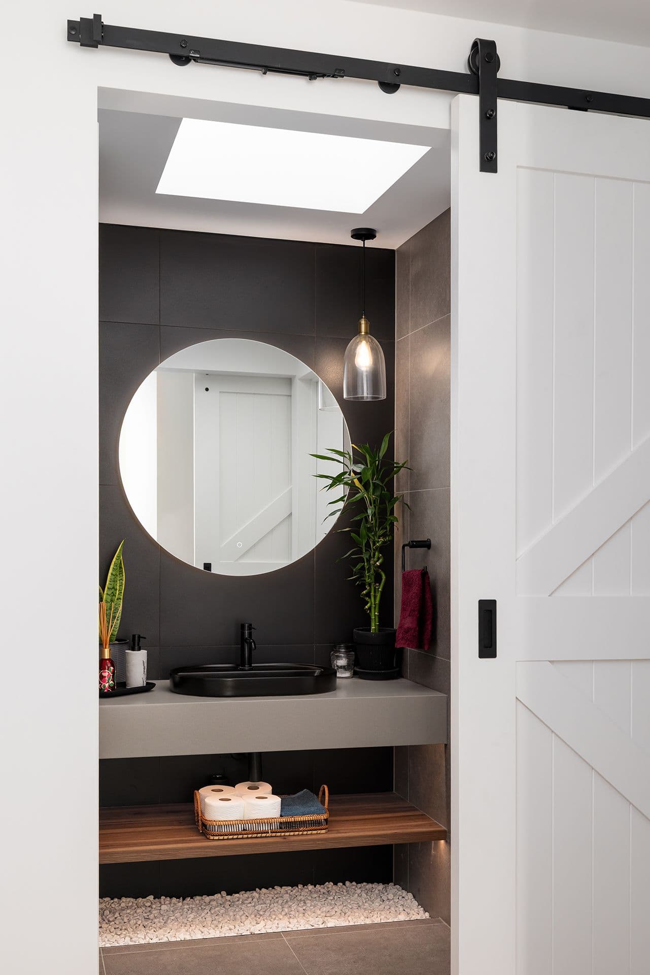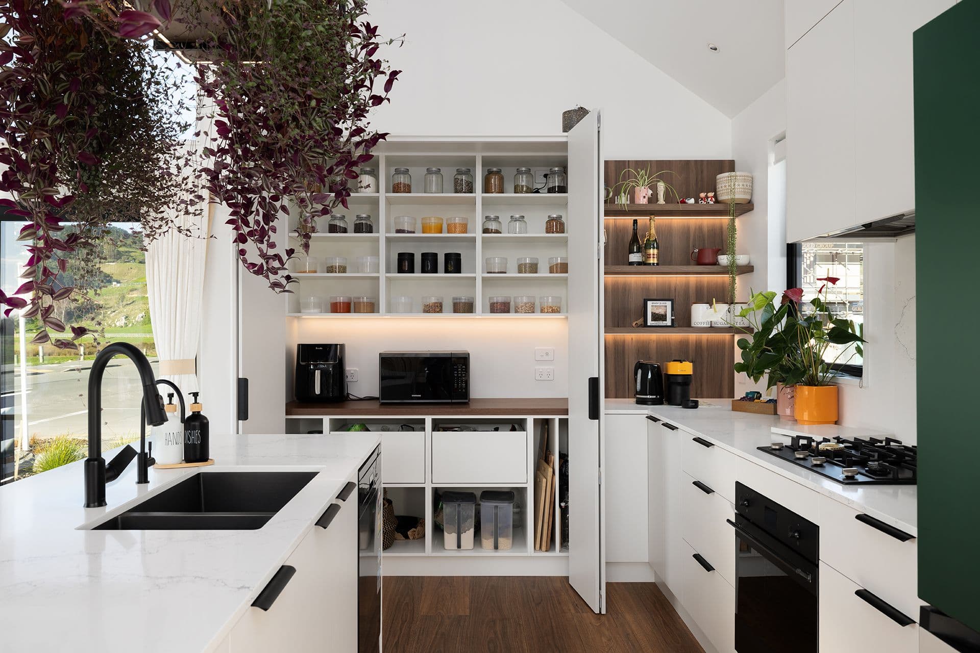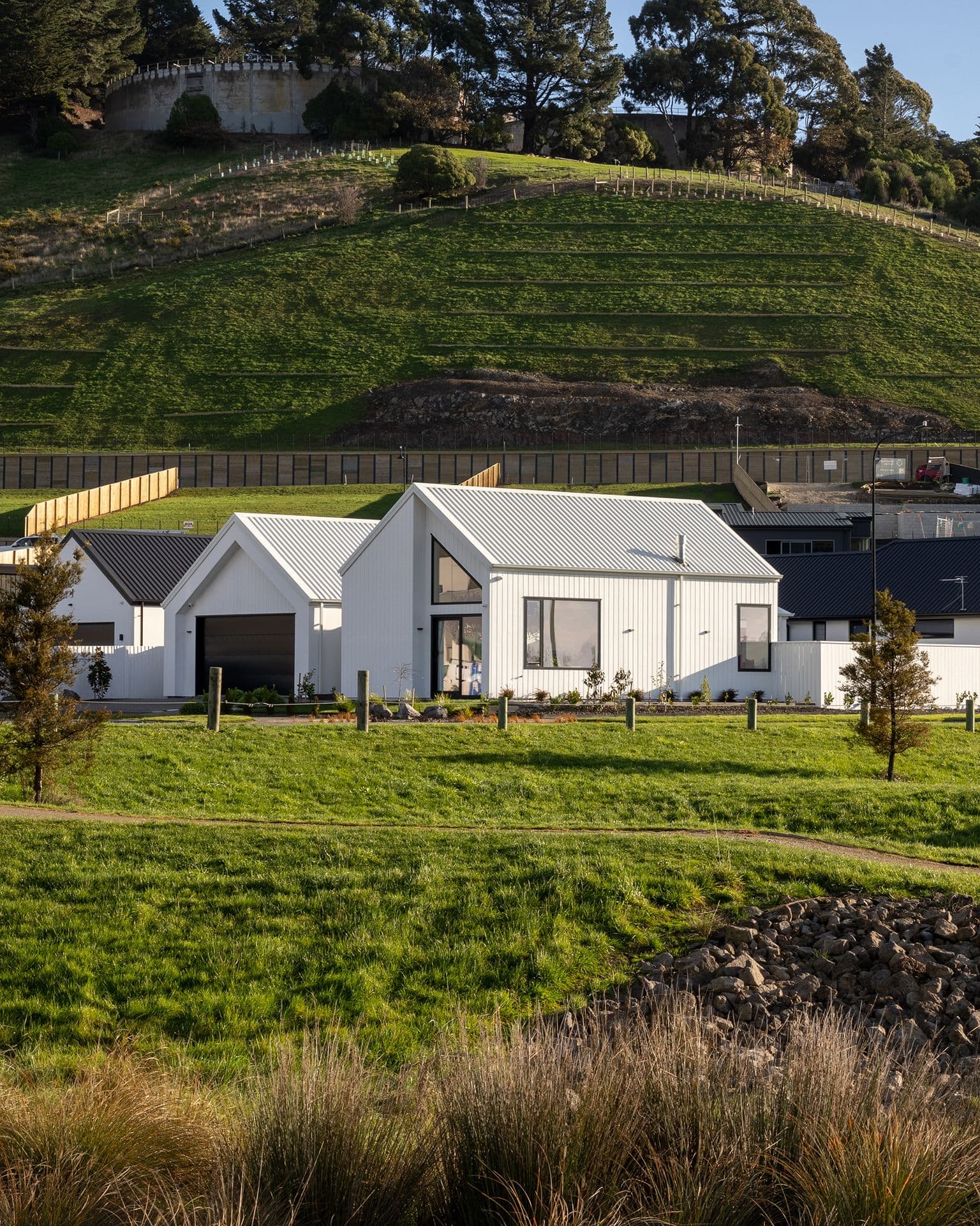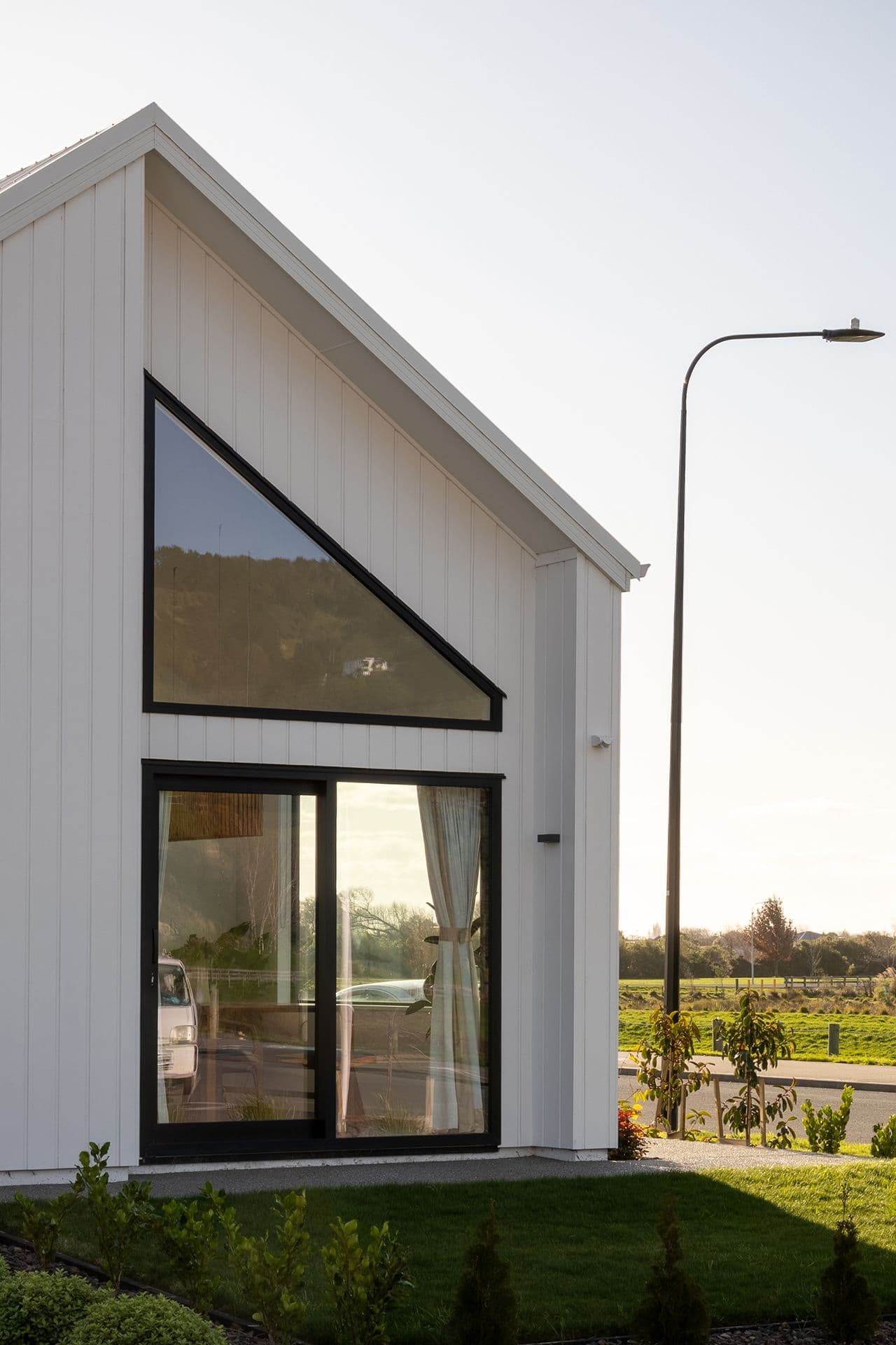 Located on a corner site in Cashmere Estate, this home showcases the classic pavilion shape. One wing is clad in Oblique for texture and detail, while the other features smooth Rockcote plaster for a crisp contrast. A raked roof in the main living area draws in light from both sides, creating a bright, airy space with a greater sense of volume.