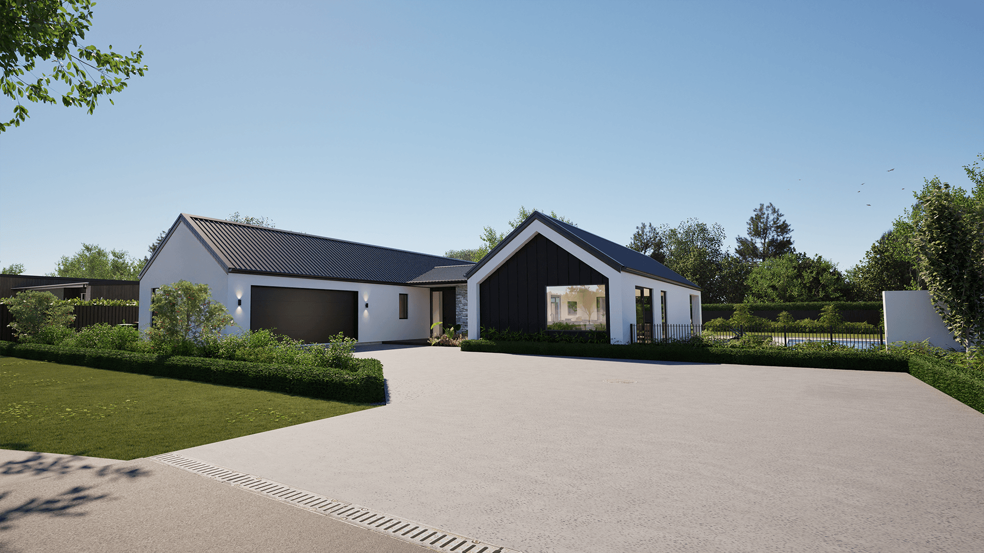This stunning Rolleston home features sleek black Rockcote, black board and batten, and striking Wanaka stone accents. Warm cedar soffits contrast the dark exterior, creating an inviting feel. A large raked window in the main living area floods the space with light and frames gorgeous views, while the expansive portico offers seamless indoor-outdoor living.